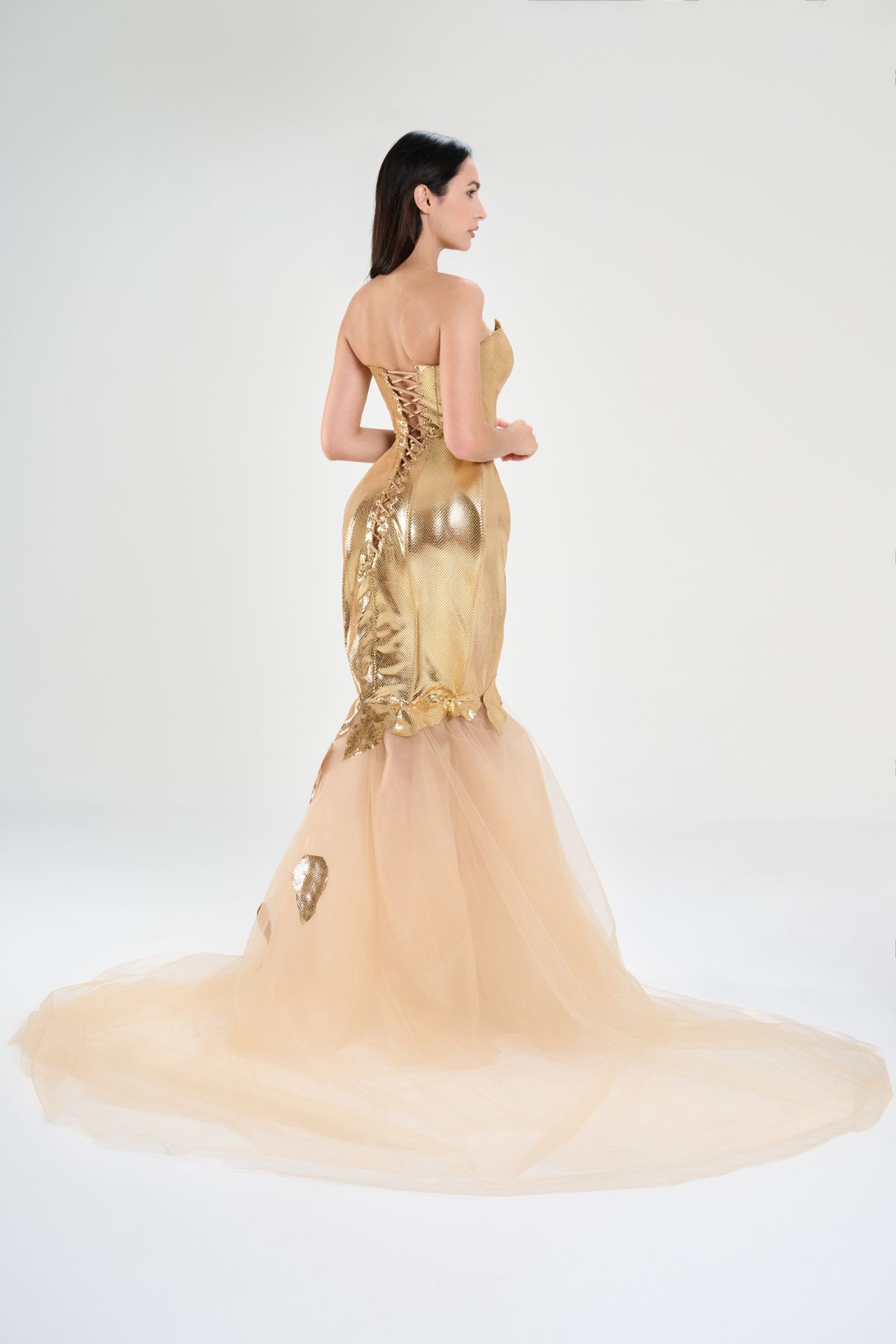 Dotyk bogini w złotej mgle. „Złota Nimfa” to suknia, która przywołuje na myśl mitologiczne piękno – urzekające, niedostępne i absolutnie niezapomniane. Gorsetowa góra o asymetrycznej linii ramienia została pokryta złotym materiałem o lustrzanym wykończeniu, który lśni niczym zbroja światła.Dolna część w stylu syreny przechodzi w obłok beżowego tiulu, zdobionego ręcznie wycinanymi złotymi liśćmi, które falują przy każdym kroku niczym fragmenty snu. Suknia dopasowuje się idealnie dzięki gorsetowemu wiązaniu, podkreślając sylwetkę w najbardziej zmysłowy sposób.Dla kobiety, która nie wchodzi – lecz pojawia się, jak zjawisko.