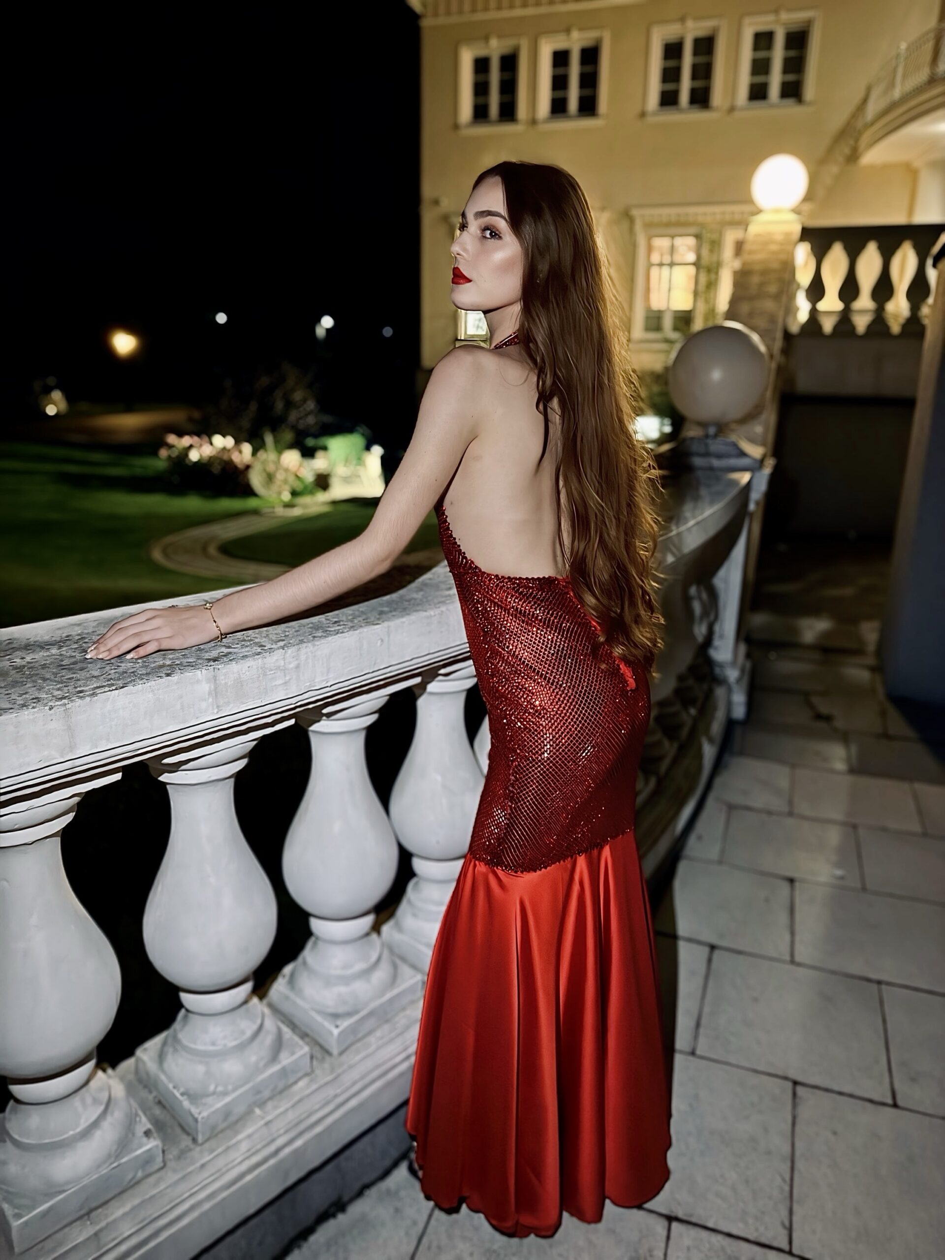 Ta wyjątkowa suknia wieczorowa w kolorze intensywnej czerwieni to kwintesencja kobiecej zmysłowości i elegancji. Góra sukni została wykonana z połyskującej, ręcznie wysadzanej tkaniny, która pięknie odbija światło i podkreśla sylwetkę. Głęboki dekolt w kształcie litery V oraz odsłonięte plecy nadają kreacji odważnego charakteru, idealnego na wyjątkowe okazje.