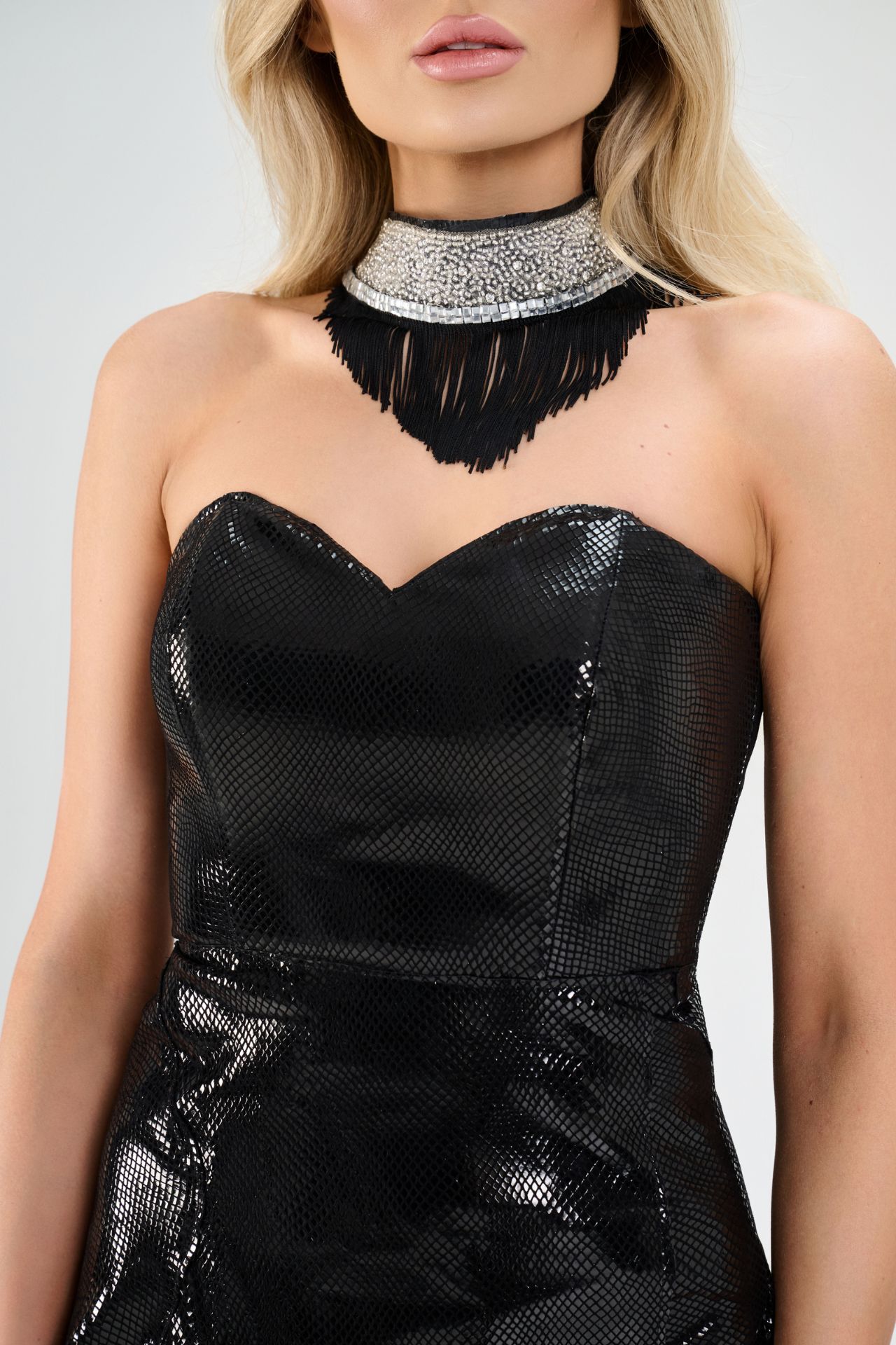Delikatnie rozkloszowany dół z wysokim rozcięciem dodaje dramatyzmu i dynamiki każdemu krokowi, a metaliczna faktura materiału odbija światło niczym tafla nocy. Zestaw dopełnia efektowna ozdoba na szyję – biżuteryjna, z frędzlami i błyskiem – będąca integralnym elementem tej stylizacji.