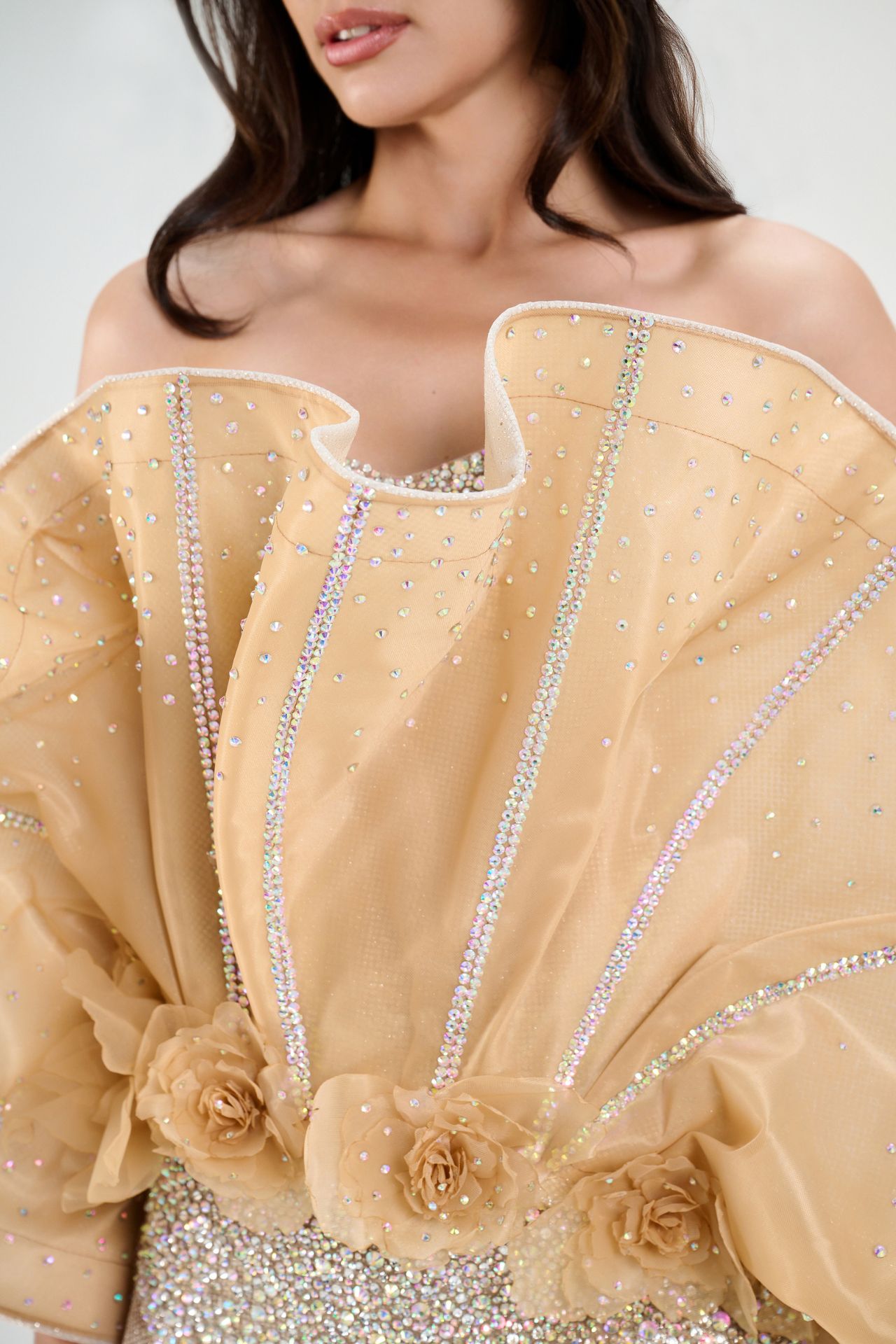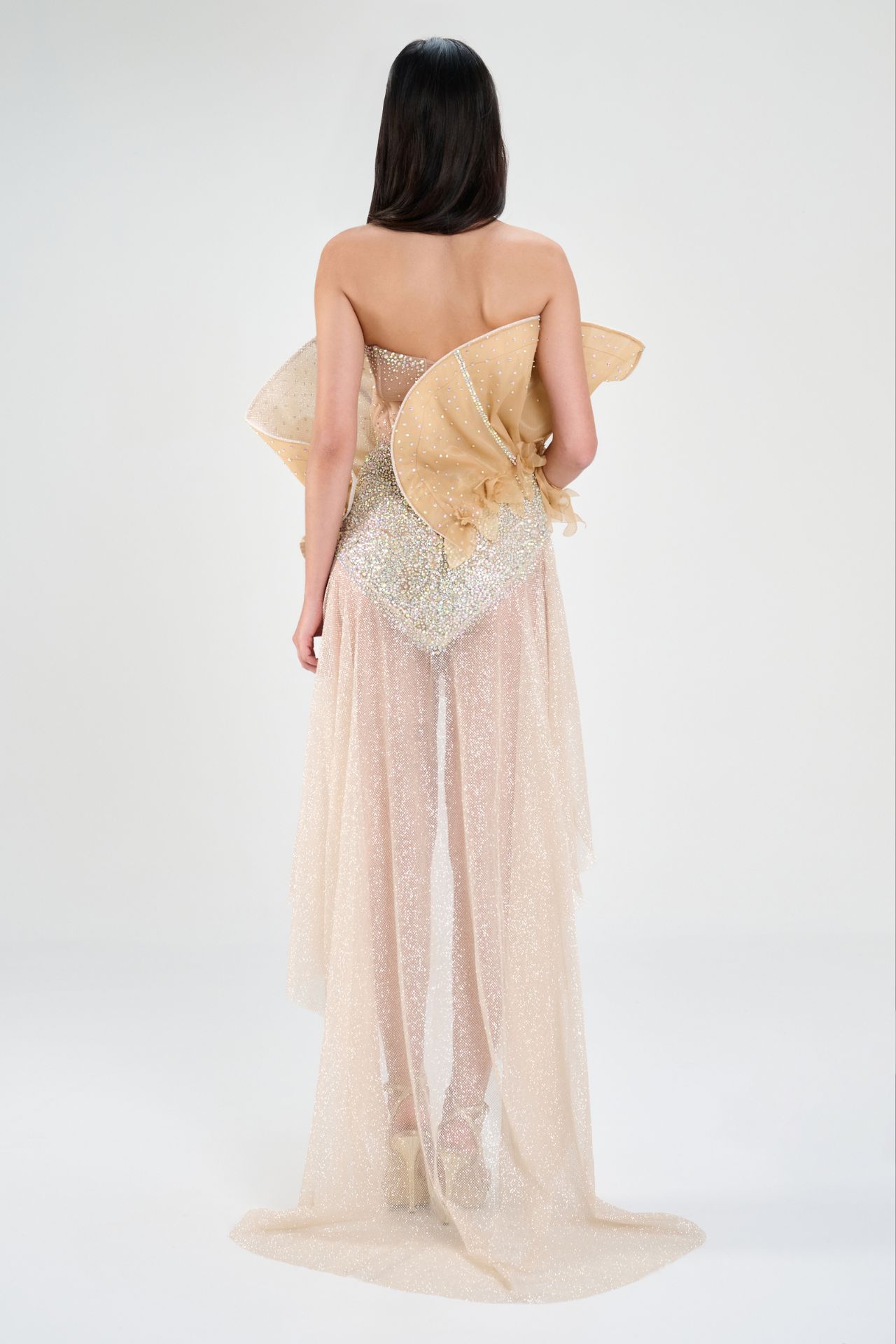 Delikatność, która błyszczy mocniej niż noc. „Złota Rosa” to bajkowa kreacja o eterycznym charakterze, w której każda linia przypomina kropelkę światła osiadającą na płatkach kwiatów. Góra sukni została uformowana z tiulowego wachlarza, wyszywanego kryształkami i zakończonego trzema ręcznie robionymi kwiatami.