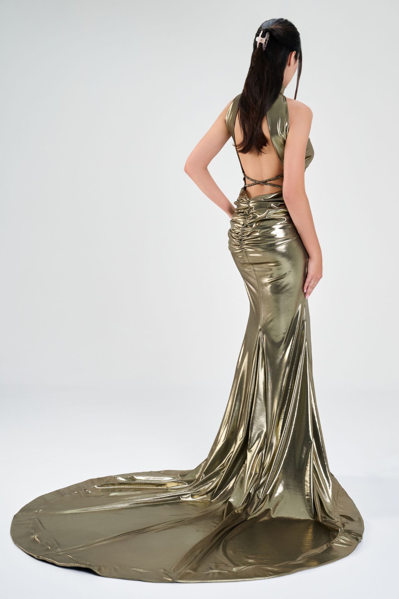 Cisza, z której rodzi się efekt wow. „Złoty Obłok” to suknia, która nie potrzebuje ozdobników – jej siła tkwi w formie i blasku. Elastyczna tkanina o płynnym, metalicznym wykończeniu przylega do ciała jak druga skóra, tworząc sylwetkę pełną elegancji i magnetyzmu.